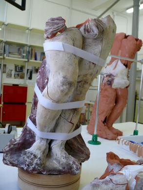 Een groot probleem vormt de kwetsbaarheid van de 'sauslaag' die is aangebracht. Hierdoor is het tijdelijk tapen van scherven niet mogelijk. Alleen aan de binnenzijde is tape aan te brengen. Maar op die manier worden scherven niet goed in positie gehouden. Daarom is het belangrijk alvast na te denken over een positionering van de scherven tijdens uitharding van de lijm.